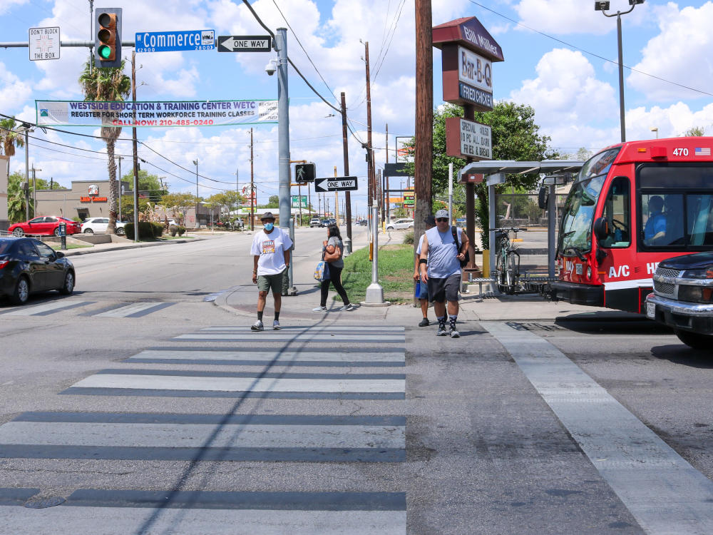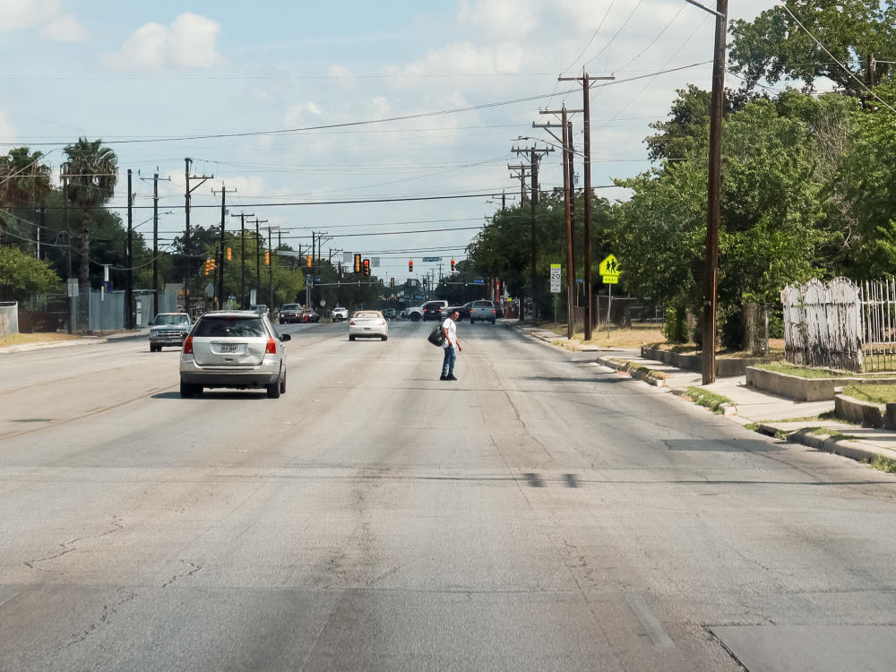 Three girls cross busy Zarzamora Street at San Fernando Street.